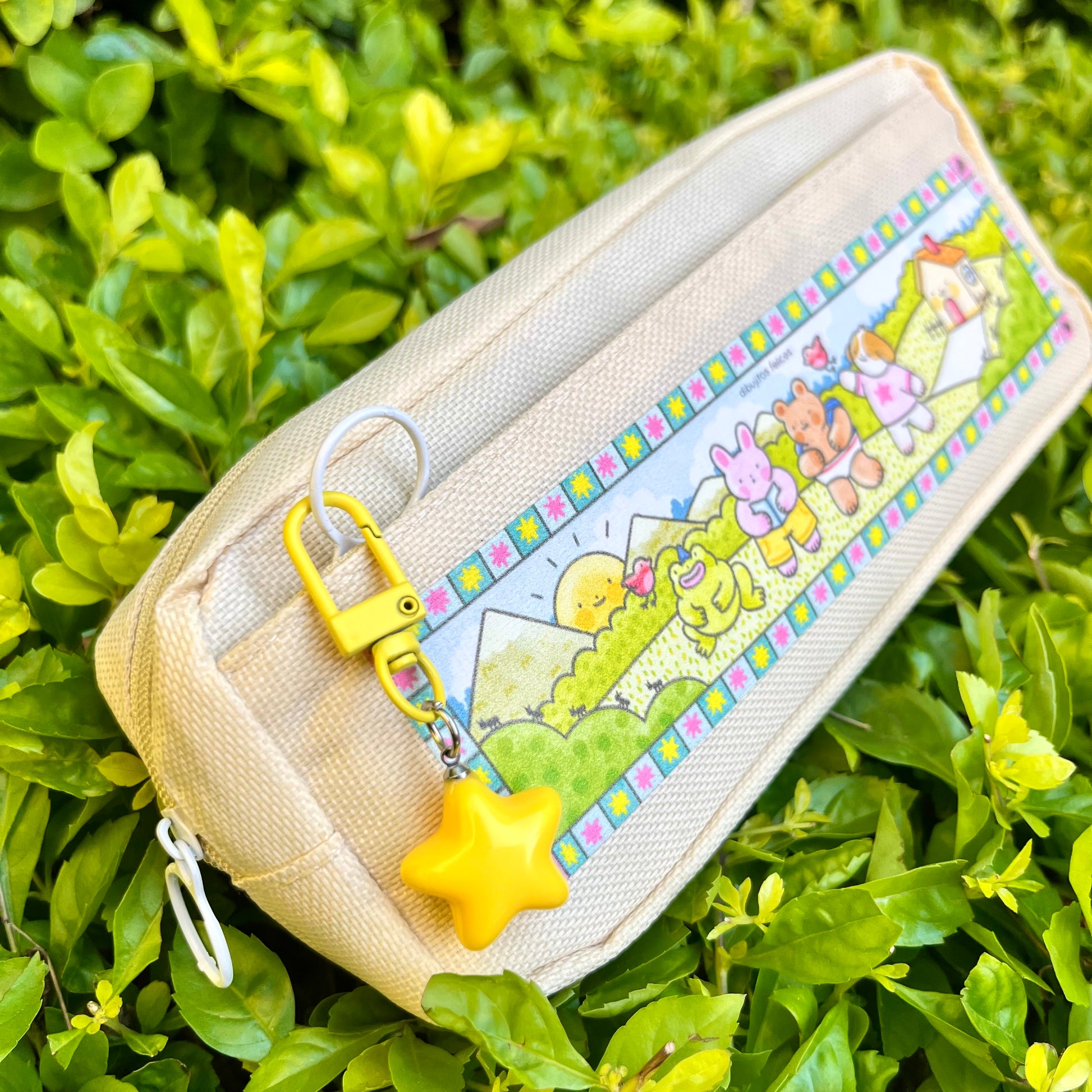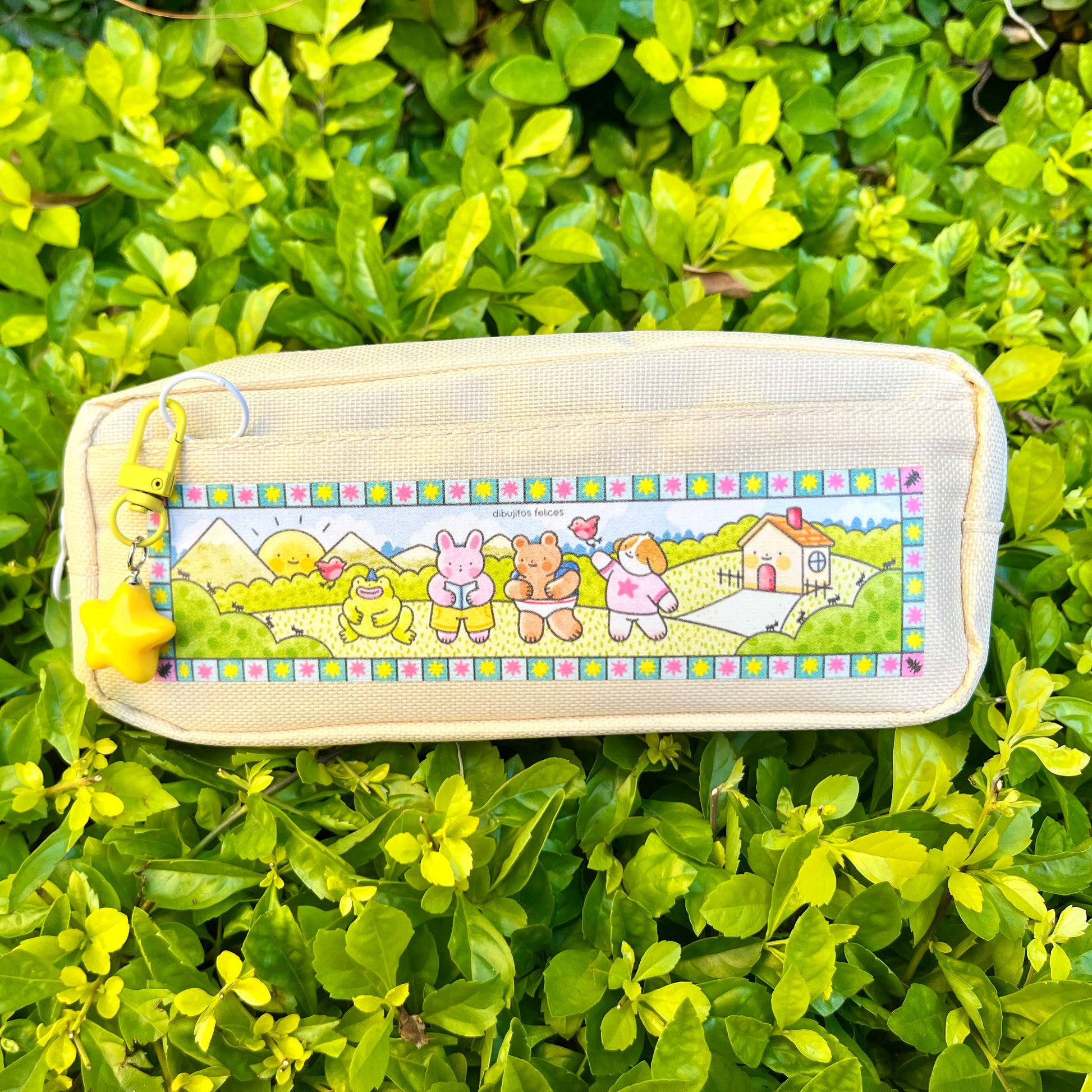 Esta lapicera de tela tiene una bolsa principal espaciosa y un bolsillo frontal perfecto para organizar tus plumas, colores, notas o lo que necesites tener a la mano. Al frente lleva una impresión en de alta calidad con una ilustración original de Dibujitos Felices: un paisaje lleno de ternura con una rana, un conejito, un oso y un perrito, acompañados de una casita y montañas al fondo.